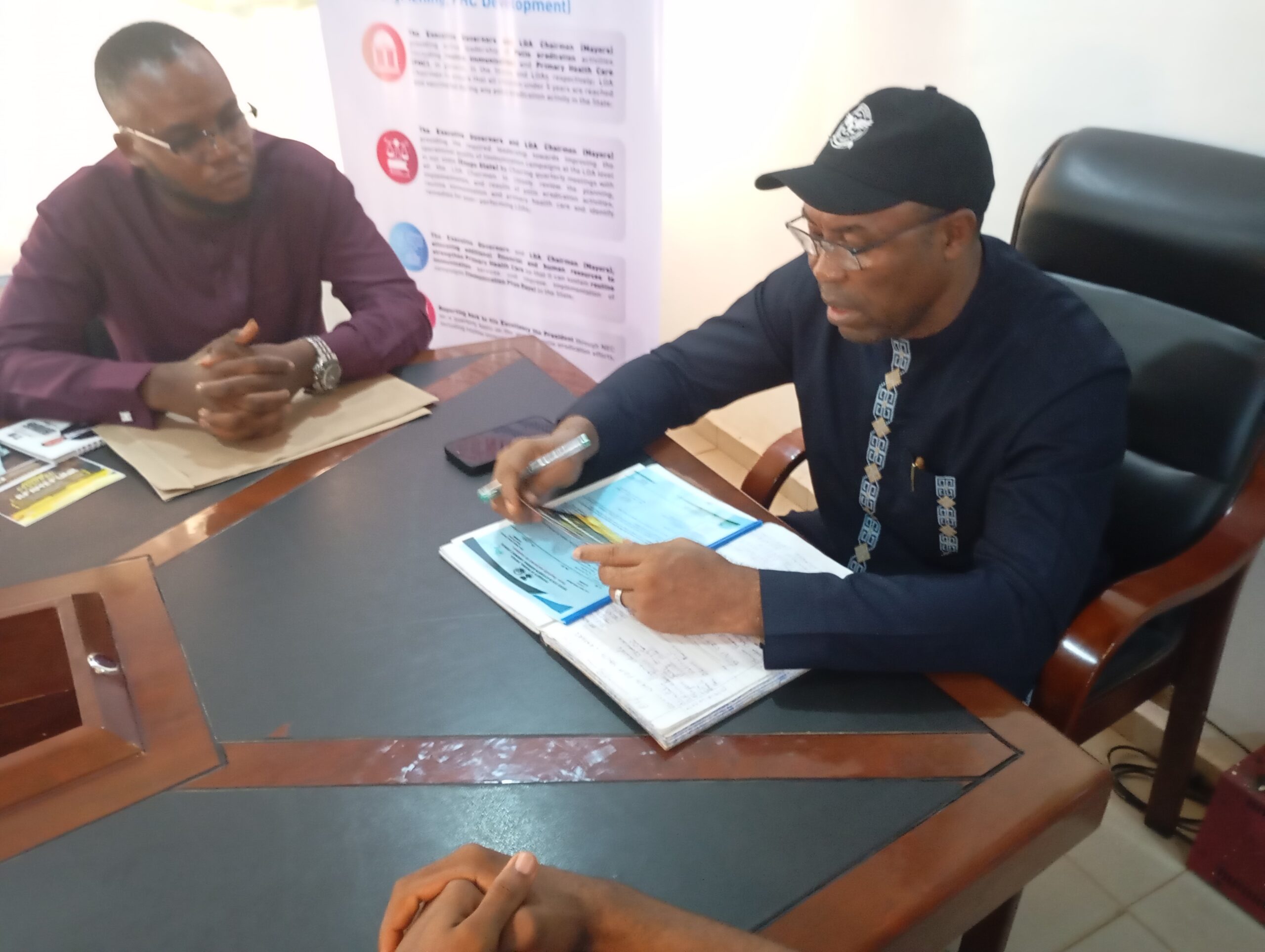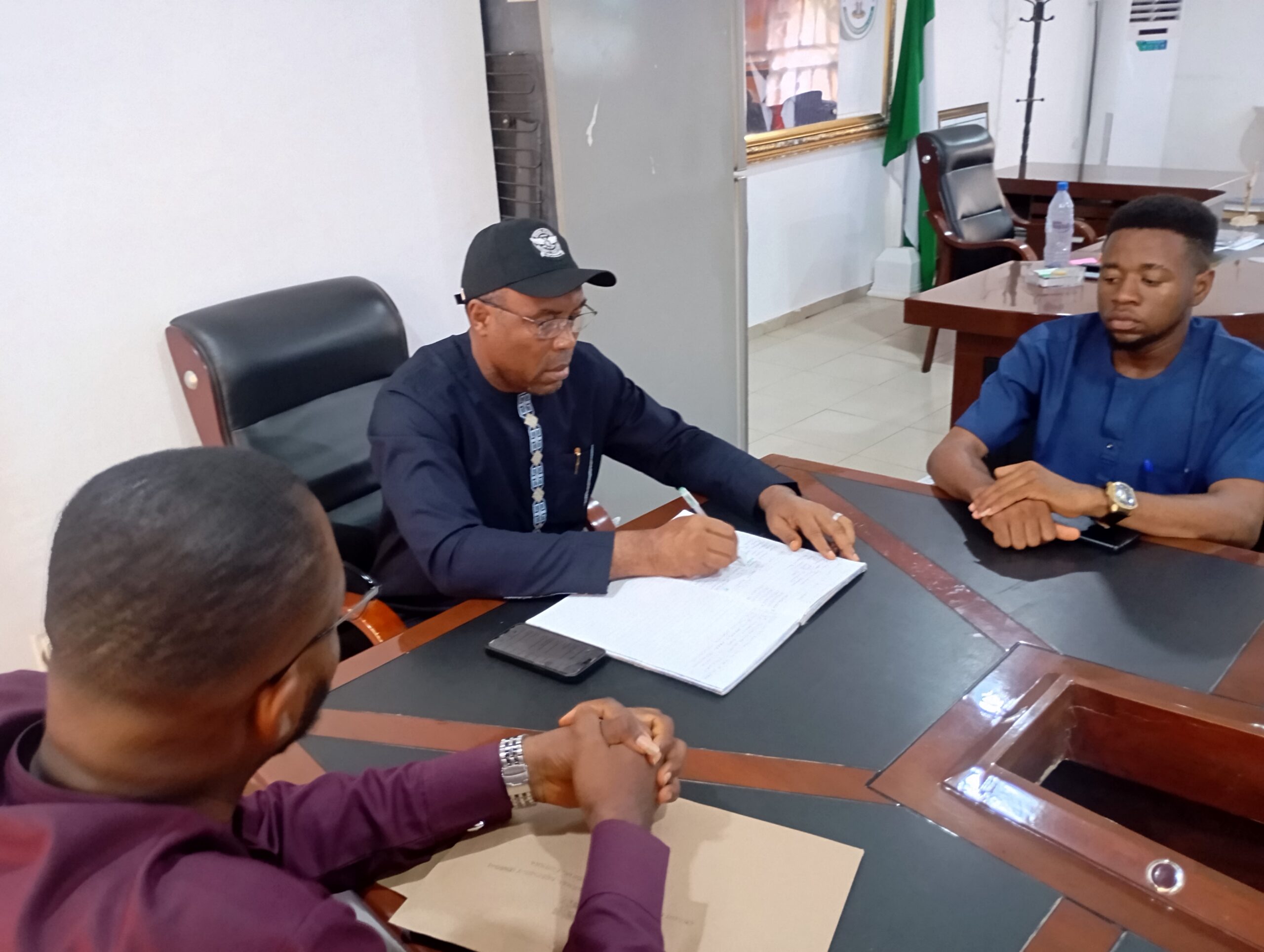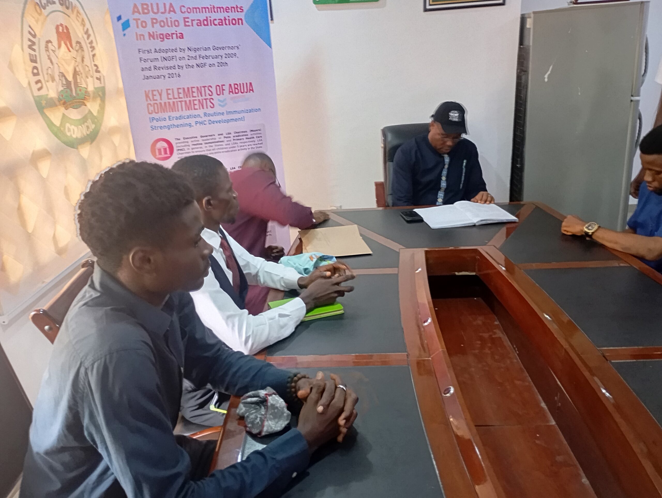 Aka Eze Aka (Udenu LGA Chairman), addressing the ENSGA delegation in his Office at Obollo Afor