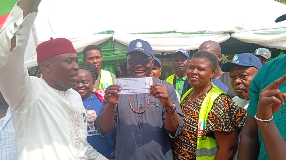 Ozalla Ezimo Village Square witnessed a significant political gathering today as Hon. Dr. Chinedu Onuh (Agunechibe II of Ezimo) formally enrolled in the All Progressives Congress (APC) e-registration exercise, reinforcing the party’s growing grassroots strength in Udenu Local Government Area of Enugu State.