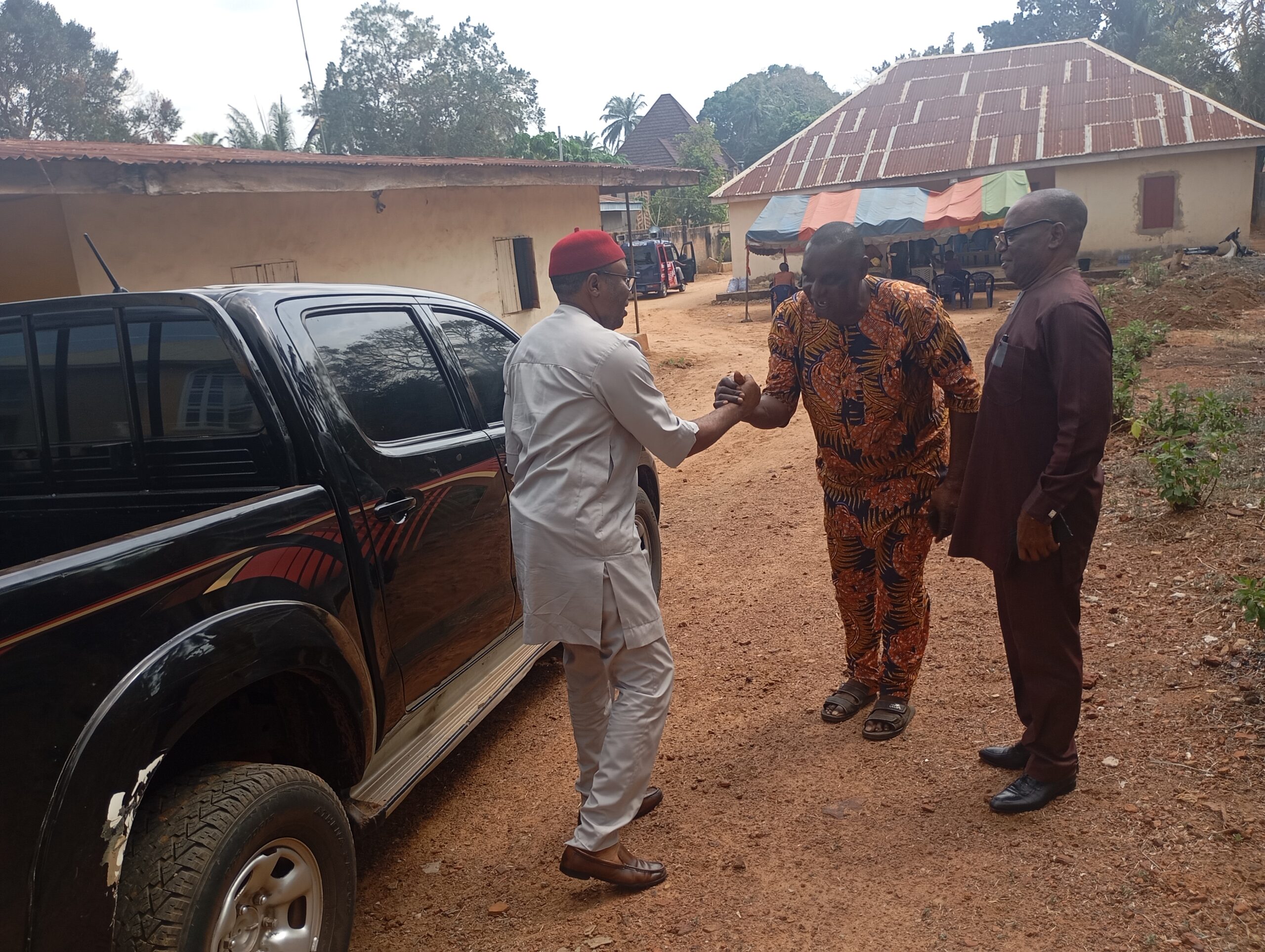 Udenu Mayor arrives Chief Aba Asogwa family compound, venue of the meeting. He was being received by Chief Herbert Nnaji, while Hon. Innocent Eze looks on