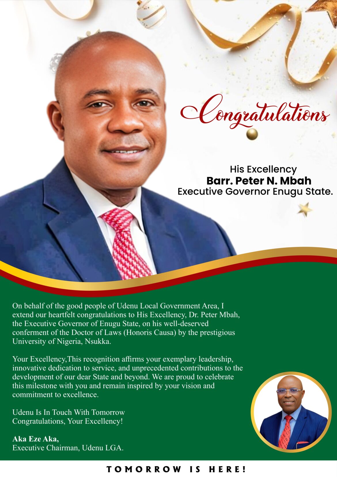 The people of Udenu Local Government Area have expressed their heartfelt congratulations to the Executive Governor of Enugu State, His Excellency Dr. Peter Mbah, on the conferment of the Doctor of Laws (Honoris Causa) by the University of Nigeria, Nsukka (UNN).