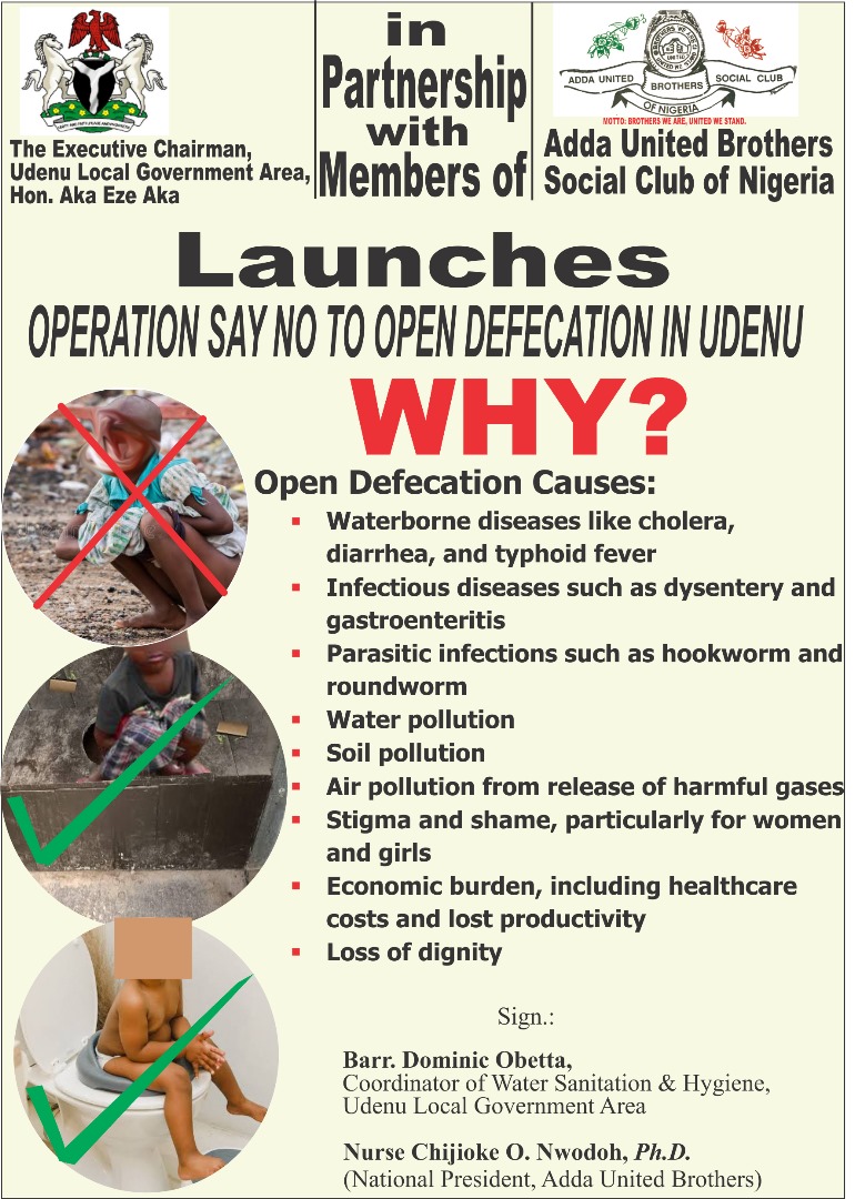 The awareness campaign, tagged “Operation Say No to Open Defecation in Udenu,” is designed to sensitize residents on the dangers of open defecation and promote the use of safe, sanitary toilet facilities. The flyer, distributed throughout the LGA, highlights the key consequences of open defecation, including: