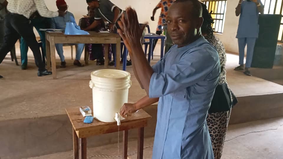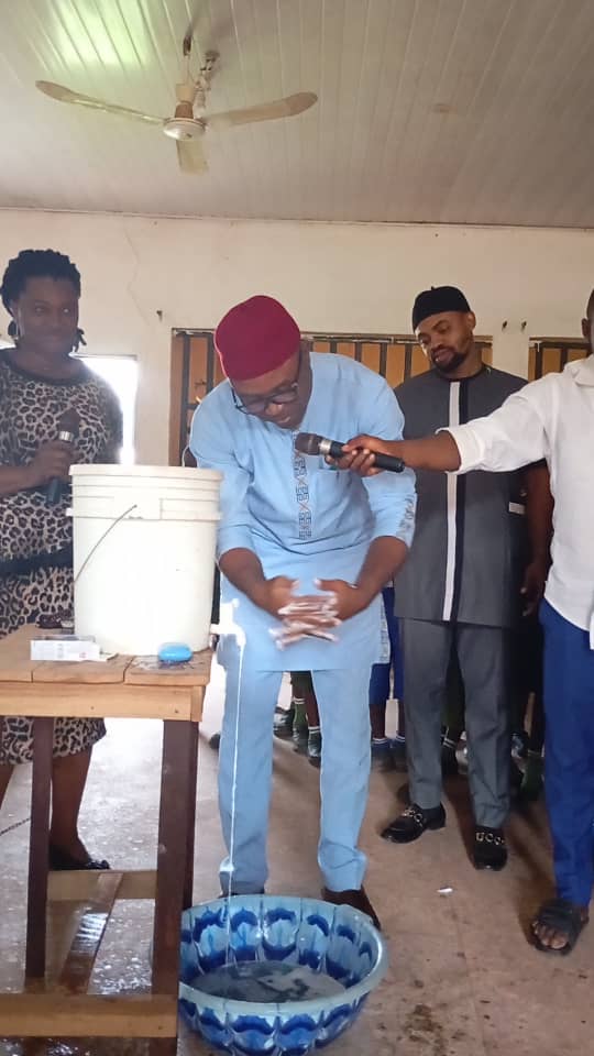 Barr. Dominic Obetta (Udenu WASH Coordinator) demonstrating safe routine hand washing technique during the occasion of International Day for regular Handwashing 2024